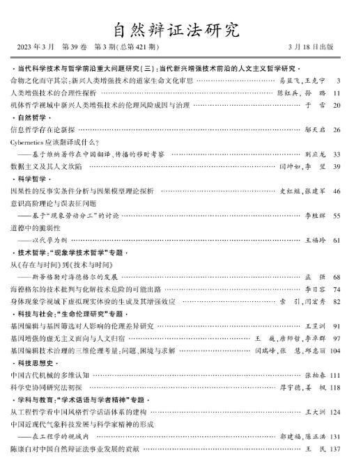 由易显飞教授与其指导的硕士研究生王克宁合作撰写的论文《命物之化而守其宗:新兴人类增强技术的道家生命文化审思》发表在校定一类刊物《自然辩证法研究》2023年第3期。该文系易显飞教授主持的国家社科基金重大项目阶段性成果之一。